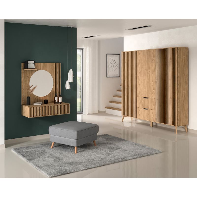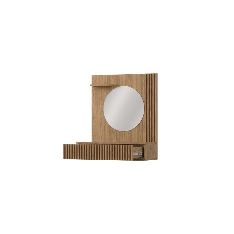 Az Entsian hiúságasztal elegáns és praktikus megoldás hálószobája vagy fürdőszobája számára. A funkcionalitás és a stílus figyelembevételével tervezett hiúságasztal megfelel az Ön elvárásainak. Kompakt méretekkel rendelkezik, hogy tökéletesen illeszkedjen a különböző terekbe. Mélysége 40 cm, szélessége 85 cm, magassága pedig 100 cm, így bőséges tárolófelületet és helyet biztosít a napi ápolási rituálékhoz. Robusztus felépítése ellenére mindössze 44 kg a súlya, így könnyen mozgatható és felállítható. Az Entsian hiúságasztal tartós deszka anyagból készült, így hosszú távú használhatóságot biztosít. A két fiók dekoratív, faragott előlapokkal rendelkezik, amelyek eleganciát és stílust kölcsönöznek az általános kialakításnak. A fiókok ABS élbevonata további védelmet nyújt a sérülések ellen, és meghosszabbítja a bútor élettartamát. Ezenkívül az Entsian hiúságasztal egy kis polcot is tartalmaz a kisebb tárgyak elérhető közelségben történő tárolásához. A készlethez tartozik egy 50 cm átmérőjű tükör is, amely tökéletesen kiegészíti az együttest. A tükör üvegének vastagsága 3 cm, ami biztosítja annak szilárdságát és ellenállását a sérülésekkel szemben. Az egész Entsian Vanity Table gyönyörű Oak Artisan színben készült, ami természetes és kellemes megjelenést kölcsönöz a bútornak. Ez lehetővé teszi, hogy zökkenőmentesen illeszkedjen a különböző lakberendezési stílusokhoz, és könnyedén kiegészítse a tér meglévő esztétikáját. Az Entsian hiúságasztal nem csak egy praktikus tárolási megoldás, hanem egy stílusos dekorációs elem is, amely bájt és eleganciát kölcsönöz a térnek.