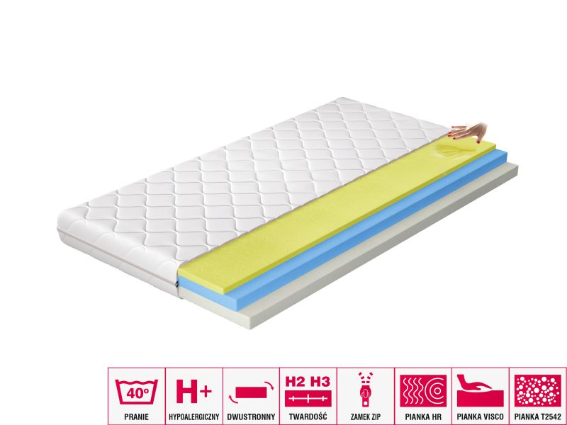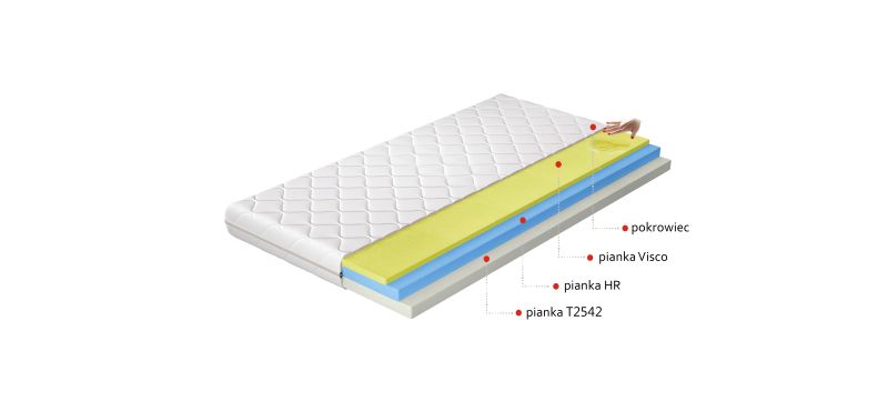 A Simona matrac a legmagasabb minőségű anyagokból készült termék, ideális a kiváló minőségű alvást értékelők számára. A három habszivacs használatának köszönhetően rendkívül kényelmes matrac. A nagy rugalmasságú HR habot az egyik oldalon Visco hab veszi körül, amely rendkívül puha, a másik oldalon pedig T2542 hab. A Simona termoelasztikus matracot levehető kasmír huzat borítja.