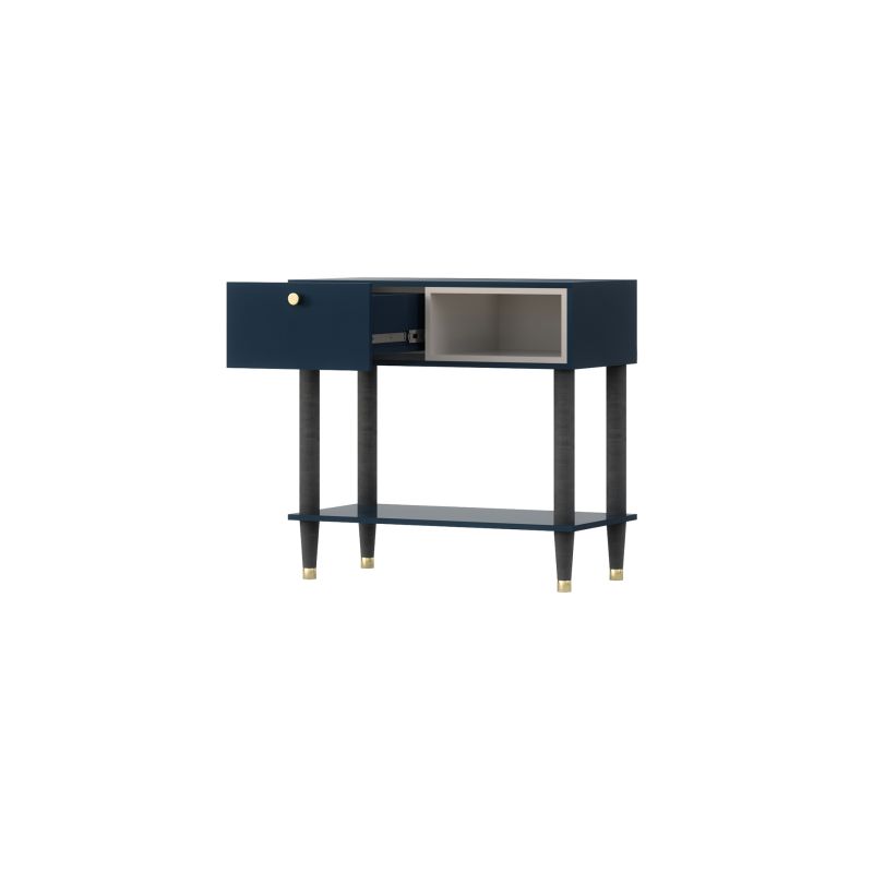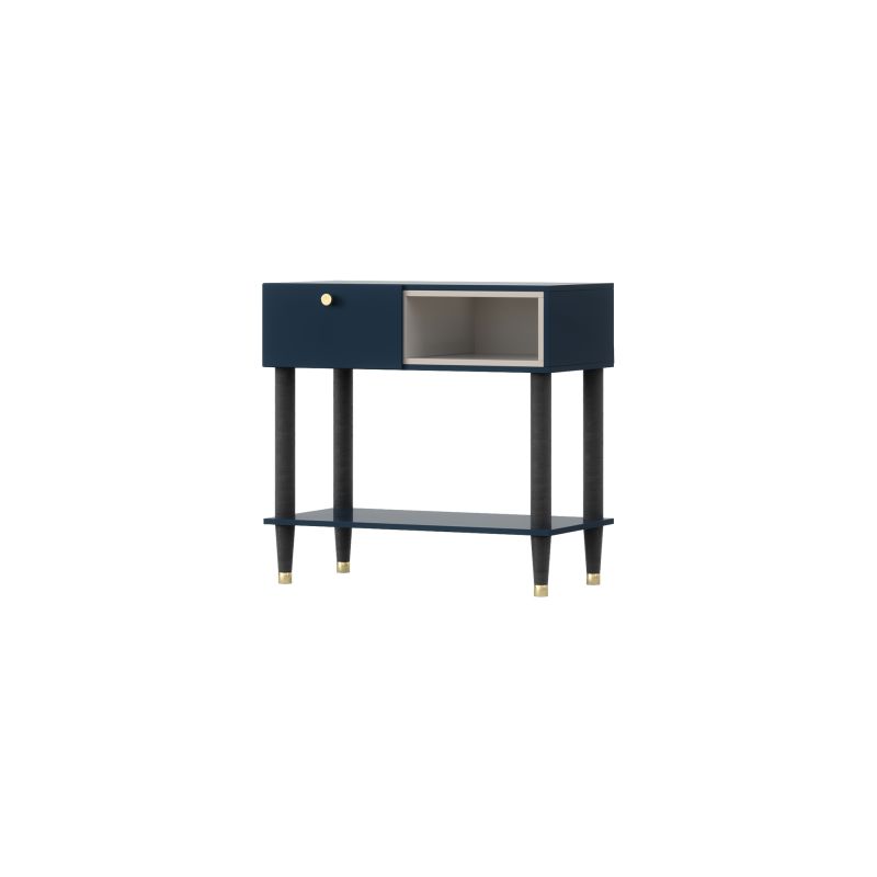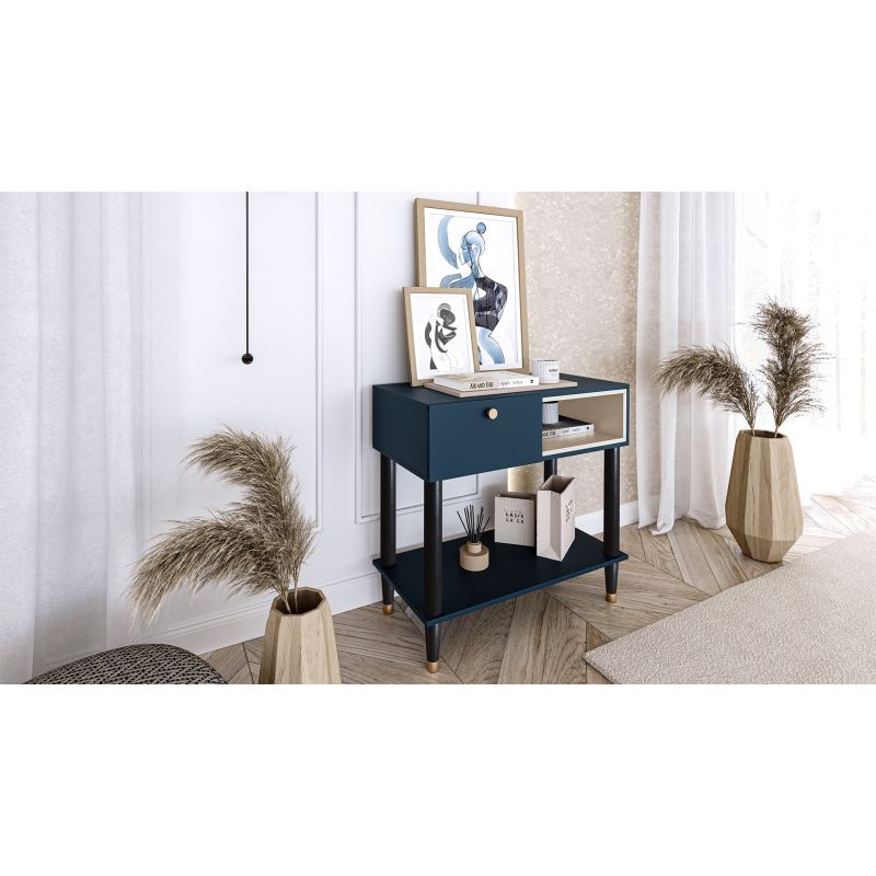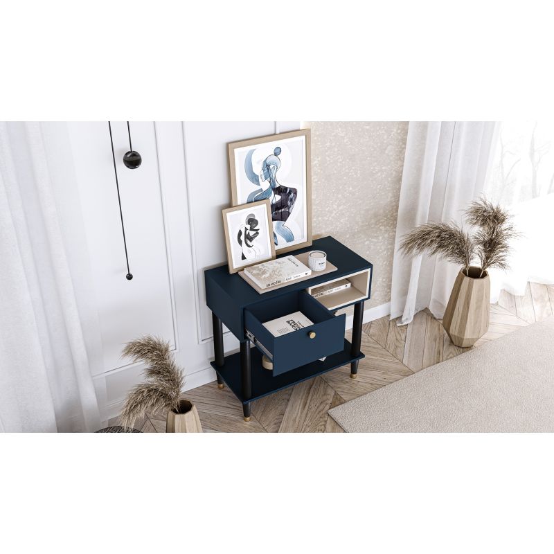 Az Includo konzol egy elegáns és praktikus bútordarab, amely tökéletesen illeszkedik a belső térbe. A részletekre odafigyelve tervezett konzol ötvözi a funkcionalitást az esztétikummal, egyedi hangulatot teremtve a térben. Az Includo konzol méretei 80 cm széles, 40 cm mély és 75 cm magas, így ideális megoldás különböző terekbe. Kompakt mérete lehetővé teszi, hogy az előszobában, a nappaliban vagy akár a hálószobában is elhelyezhető legyen, bájt és funkcionalitást kölcsönözve neki. Az Includo konzol masszív, 16 mm vastag deszkából készült, így tartós és stabil. Egyedi, fehér elemekkel díszített tengerészkék kivitelezése modern jelleget kölcsönöz neki, amely jól illeszkedik a különböző lakberendezési stílusokhoz. A konzol lábai fekete fából készültek, finom aranyszínű hangsúlyokkal, amelyek eleganciát és fényűző megjelenést kölcsönöznek. Kialakításuk stabilitást és tartósságot biztosít. Az Includo konzol praktikus és rengeteg tárolóhelyet kínál. Egy fiókkal rendelkezik, amely teljes kihúzású golyóscsapágyas csúszkákkal van felszerelve, így könnyen és kényelmesen nyitható és zárható. A fiók PVC-éllel van ellátva, ami biztosítja a tartósságot és az esztétikumot. A konzol emellett egy nyitott polccal is rendelkezik, amely tökéletesen alkalmas dekorációk, könyvek vagy kedvenc tárgyak elhelyezésére. A bútor lábai közötti további polc növeli a funkcionalitást, és extra tároló- vagy bemutatóhelyet biztosít a különböző tárgyak számára. Az Includo konzol kivitelezése tökéletesen kivitelezett. A fiókok fogantyúi kiváló minőségű aranyszínű fémből készültek, ami eleganciát kölcsönöz a bútornak és megkönnyíti a használhatóságot. Az Includo konzol súlya 24 kg, ami garantálja stabilitását és szilárdságát. Minden gond nélkül használhatja a mindennapokban, különböző tárgyak tárolására használhatja, és bájt kölcsönözhet helyiségének. Az Includo konzol nem csak egy praktikus tárolási megoldás, hanem egy olyan dizájnelem is, amely előkelőbbé és stílusosabbá teszi az Ön belső terét. Tökéletes kiegészítője lesz dekorációjának, hangulatos és modern légkört teremtve otthonában.